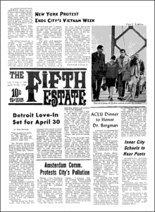 Fifth Estate Issue #28, April 15-30, 1967 WEB CONTENTS ACLU Dinner to Honor Dr. Bergman Amsterdam Committee Protests City’s Pollution Detroit Love-In Set for April 30 Inner City Schools to Hear Poets New York Protest Ends City’s Vietnam Week Michigan Senate Talks Abortion The Coatpuller Les Biederman Masthead New York Hosts Inner-Arts Festival Mime Troupe Held Off Center Our Man in Europe Views Paris Detroit Doctors Might Treat War Victims Miles Poet Named The Marijuana Papers The Science Hipsters Bonstelle Performs Garcia-Lorca Looks Like Mellow Yellow Preview Look of Expo ’67 Belle Isle Hosts Fun and Games LEMAR Puff-In Soon New York Busted For Pornography The Cinephile Air Force Captain Won’t Fight Viet War Cleveland Poet Needs Bail Money Letters to the Editors Inside Sounds International Times Busted On Obscenity Calendar ALL FIFTH ESTATE ISSUES FIFTH ESTATE HOME